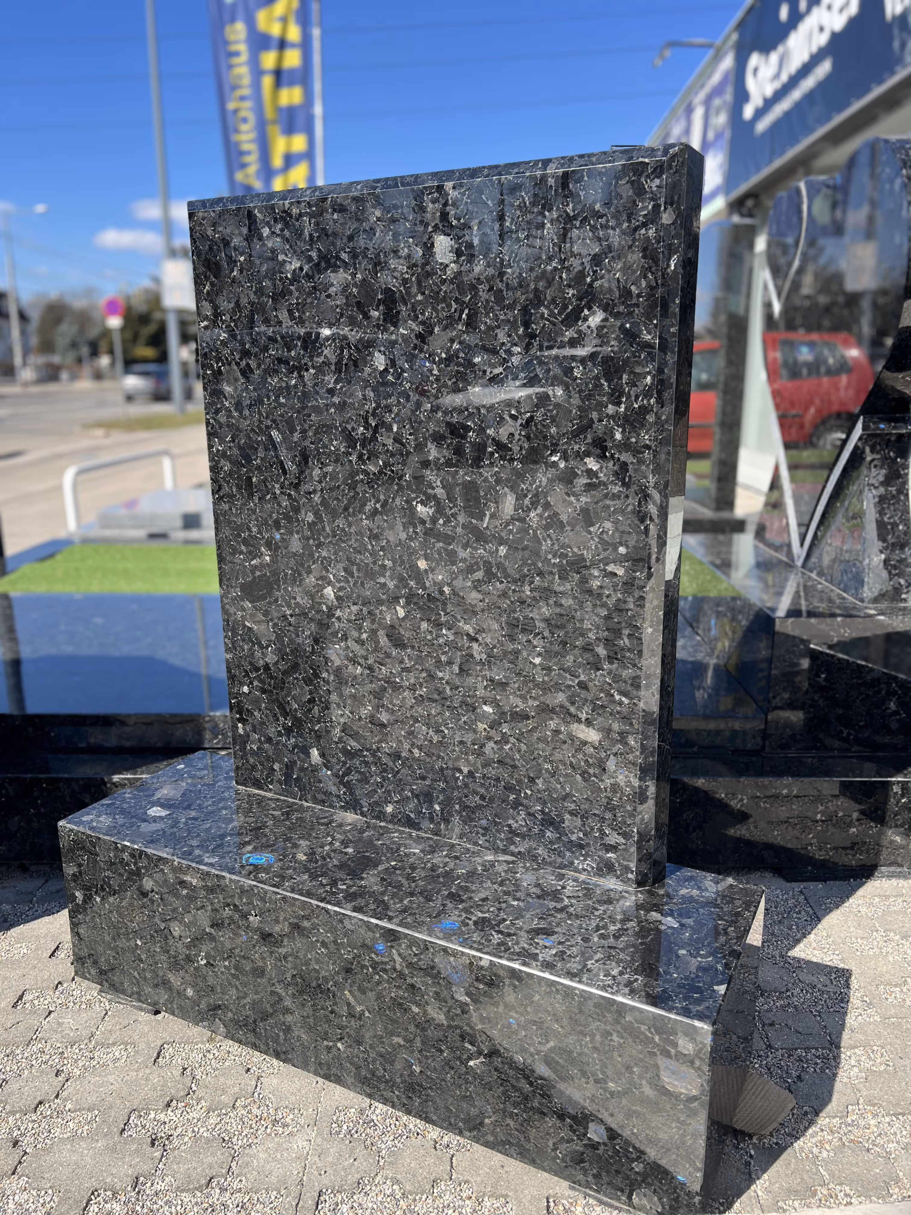Grabstein aus Labradorit mit Blaue Auge in gerader Form mit Sockel. Der Labradorit mit seinem charakteristischen blauen Schimmer verleiht diesem Grabstein eine besondere Eleganz und Einzigartigkeit. Die gerade Form unterstreicht die klassische Schönheit des Materials.