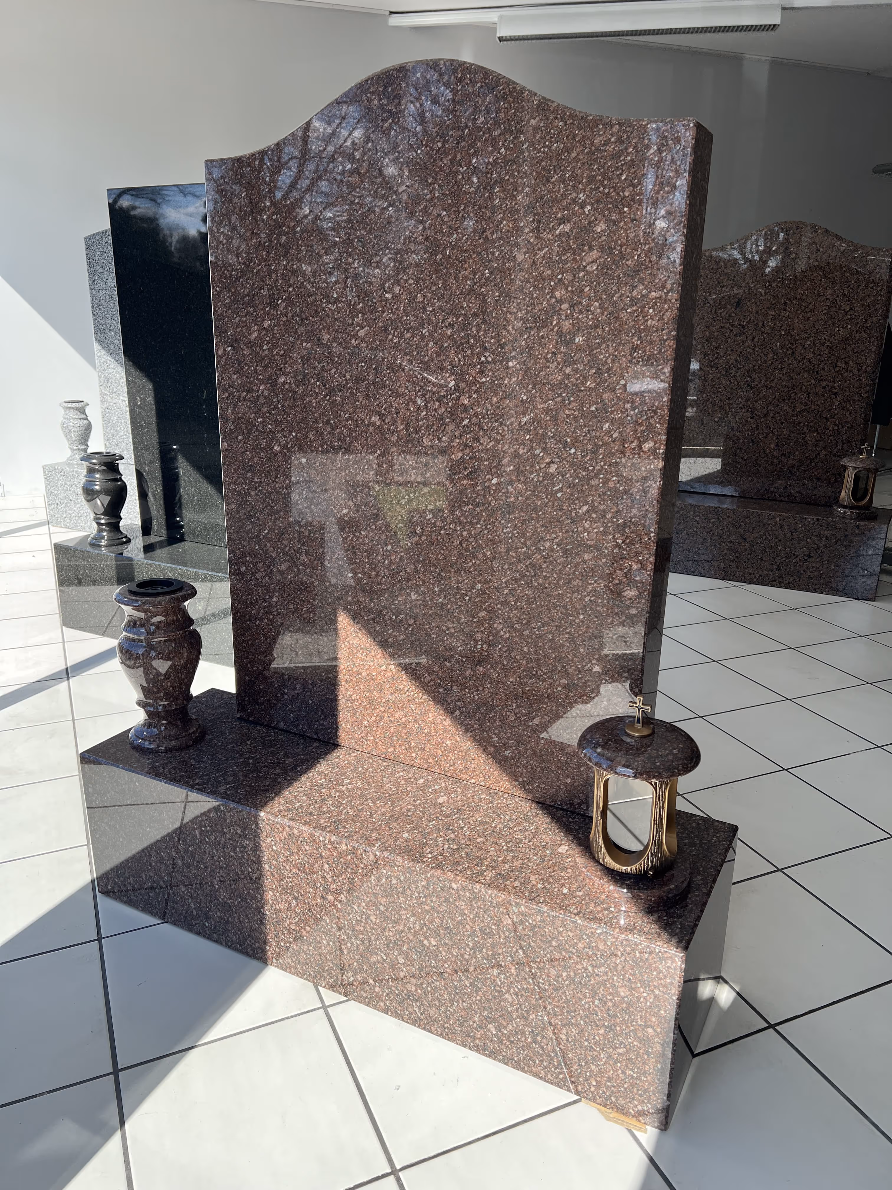 Grabstein aus Brauem Granit in Napoleon-Form mit Sockel. Der braune Granit mit seiner warmen, natürlichen Farbgebung verleiht diesem Grabstein eine besondere Wärme und Würde, ideal für ein persönliches Gedenken.