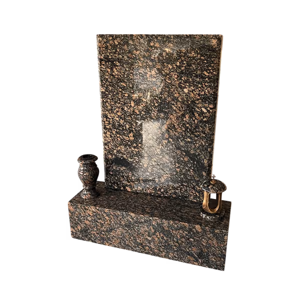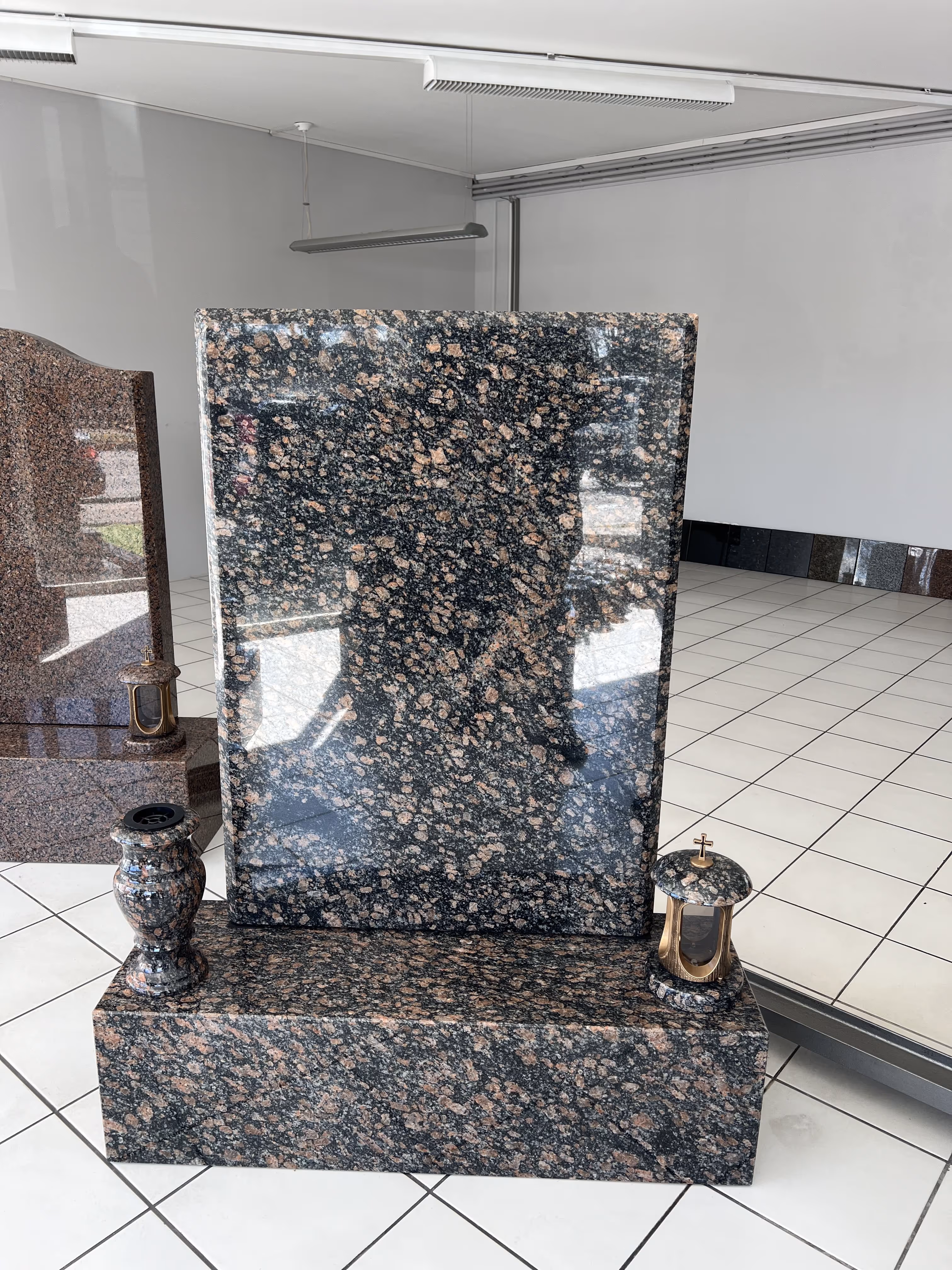 Grabstein aus Granit mit dunkler Struktur und braunem Farbton in gerader Form mit Sockel. Die einzigartige dunkle Struktur mit warmen Brauntönen macht jeden dieser Grabsteine zu einem Unikat mit charaktervollem Aussehen.