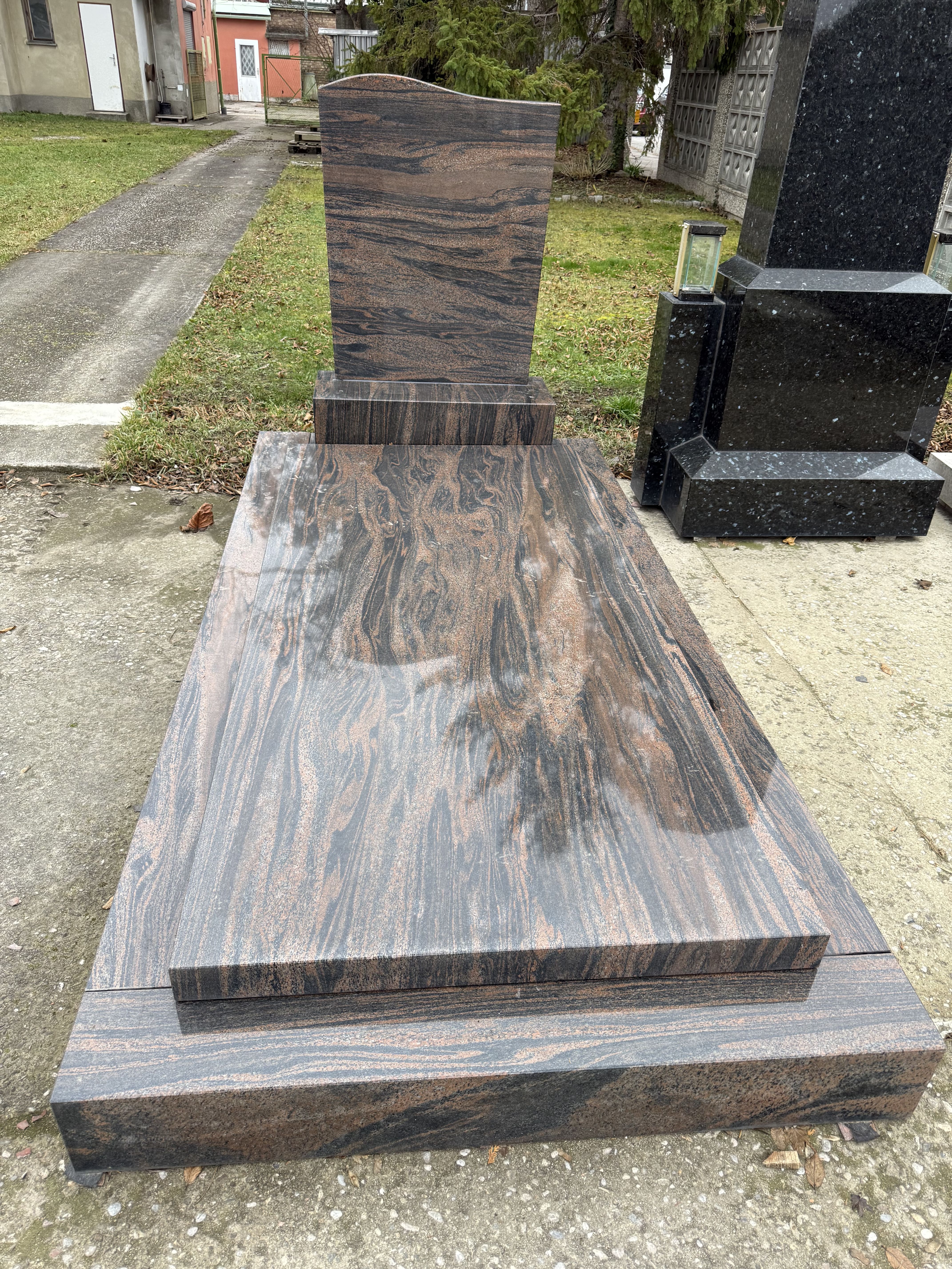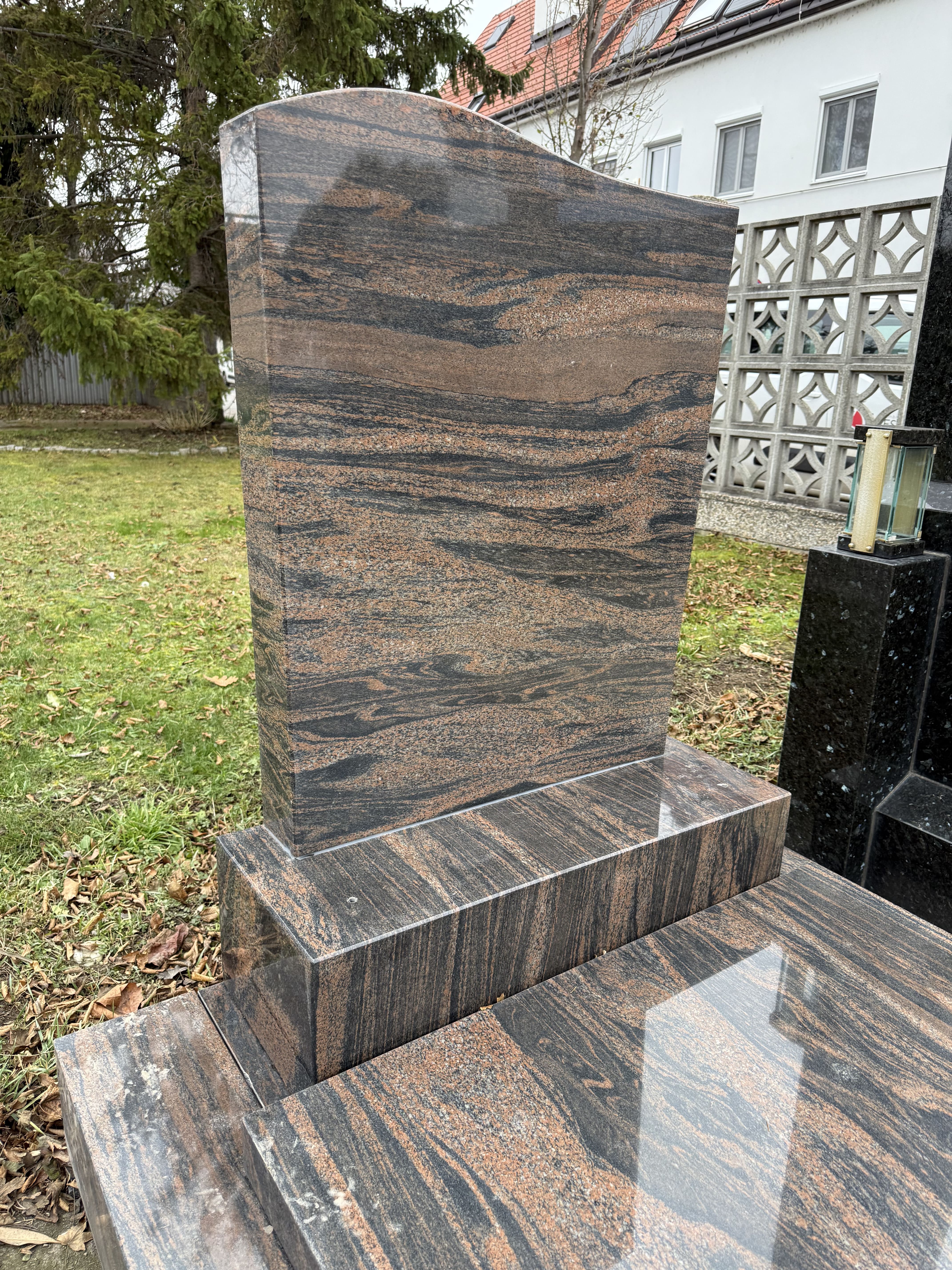 Ein eindrucksvolles Grabensemble aus Hallandia Granit, das durch seine warmen Farbnuancen in Braun und Anthrazit besticht. Nach sorgfältiger Restaurierung präsentiert sich das Ensemble mit hochglanzpolierter Verarbeitung – beständig, pflegeleicht und von zeitloser Schönheit. Die harmonisch geschwungene Stele in Verbindung mit der massiven Abdeckplatte schafft eine ruhige, würdevolle Atmosphäre. Perfekt geeignet für Einzel- sowie Mehrfachgrabstätten, bietet diese Anlage vielfältige Möglichkeiten zur individuellen Gestaltung mit Gravuren, Ornamenten oder ergänzendem Schmuck.