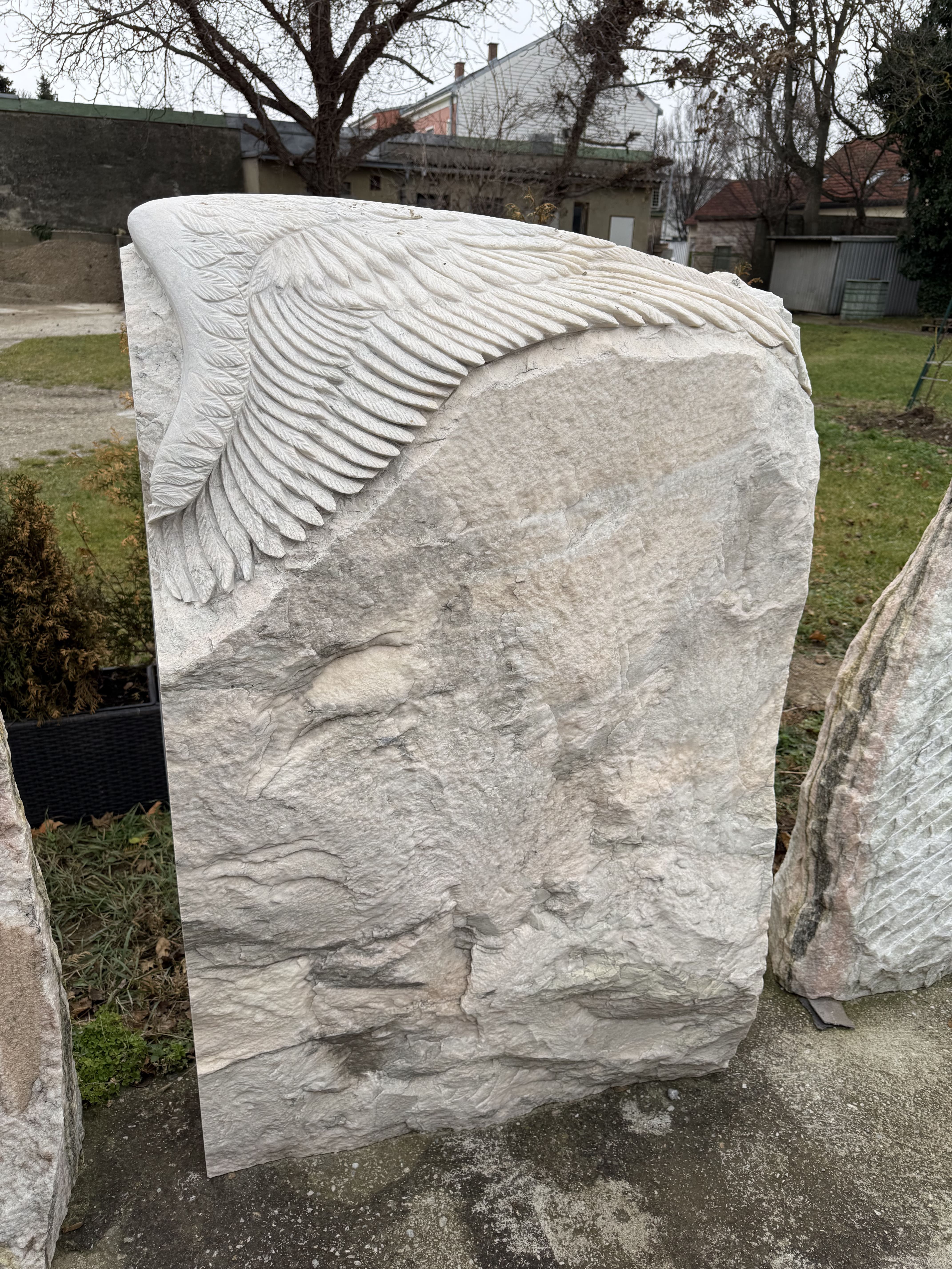 Der Gedenkstein Fels mit Flügel ist ein erlesenes Einzelgrabdenkmal aus erstklassigem Estremoz-Marmor. Die sanft wechselnden, hellen Farbnuancen und die individuelle Maserung machen jedes Element zu einem Einzelstück. Die naturbelassene Beschaffenheit in Felsoptik vermittelt Dauerhaftigkeit und Erdverbundenheit, während das handgefertigte Flügelrelief im oberen Bereich Leichtigkeit, Schutz und Zuversicht symbolisiert. Die Verbindung aus naturrauer Beschaffenheit und fein ausgearbeiteter Reliefstruktur schenkt diesem Marmor-Gedenkstein eine besondere Ausdruckskraft. Ein geglätteter Bereich auf der Vorderseite bietet Raum für eine individuelle Gravur – optimal, um diesem besonderen Denkmal eine persönliche Note zu verleihen.